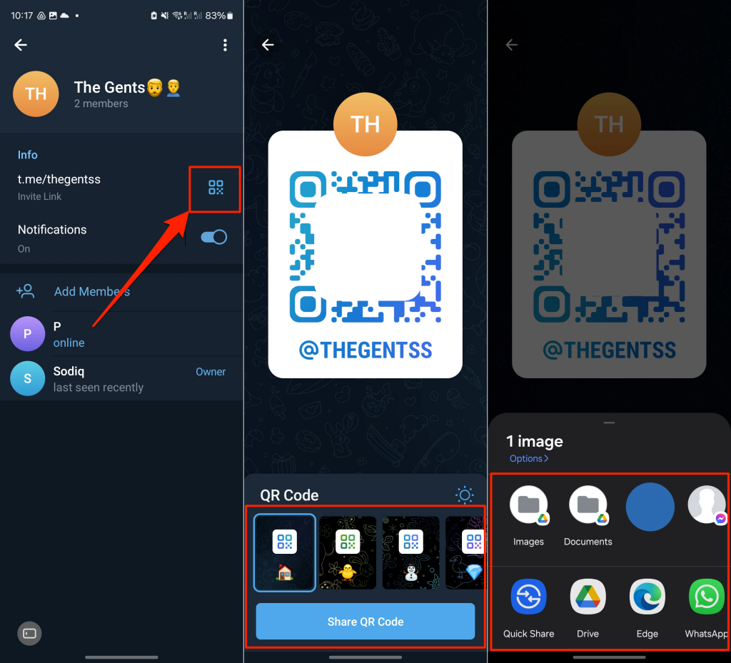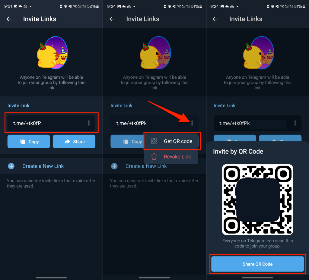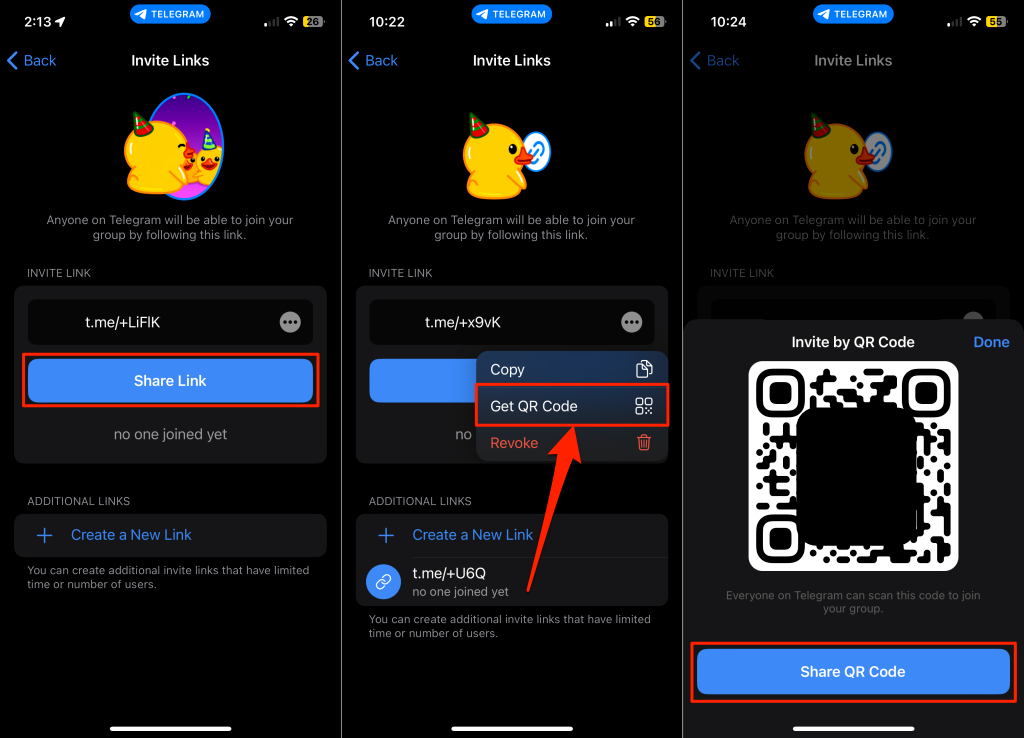 - To share the link as a QR code, tap the three-dots icon next to the link, and select Get QR Code. Then, tap Share QR Code to send the group’s invitation link to your friends or other Telegram users.