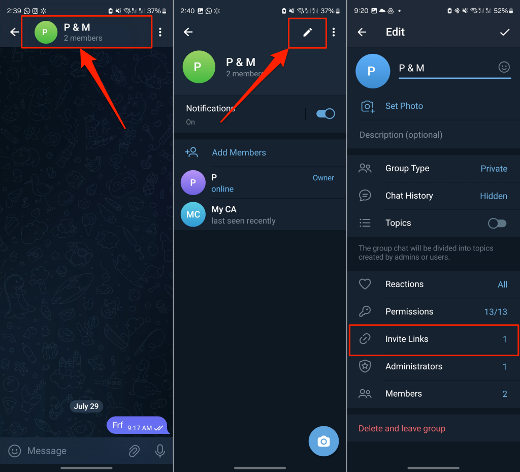 - Tap the pencil icon in the top-right corner and select Invite Links on the next screen.