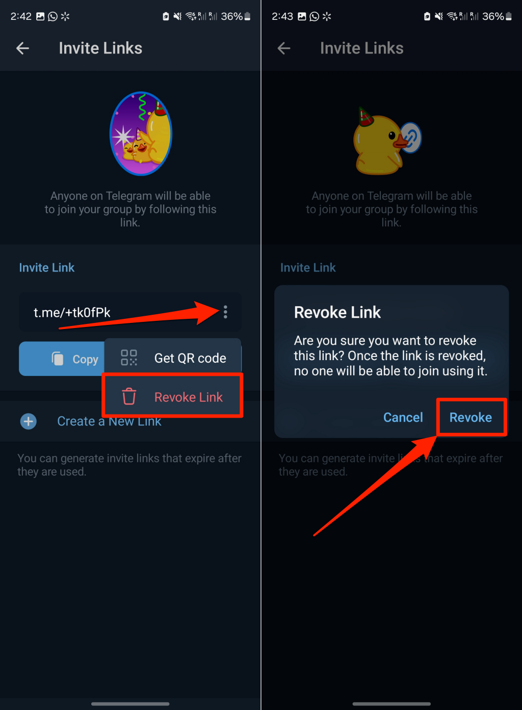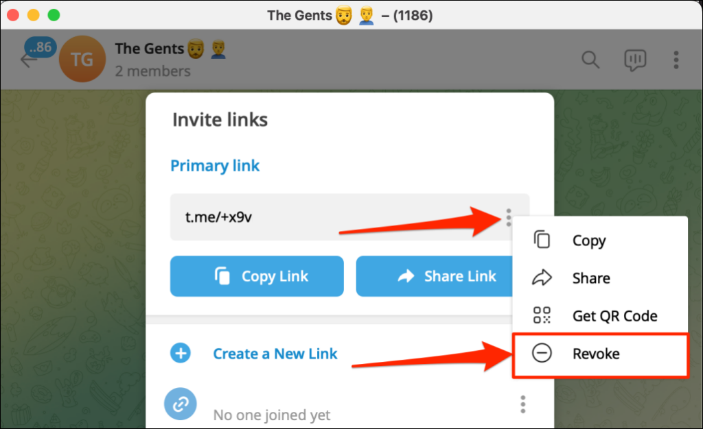Note: If you revoke your group’s primary invitation link, Telegram automatically replaces it with a new link. Send the new invite link to anyone wanting to join the group.