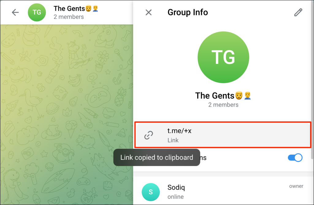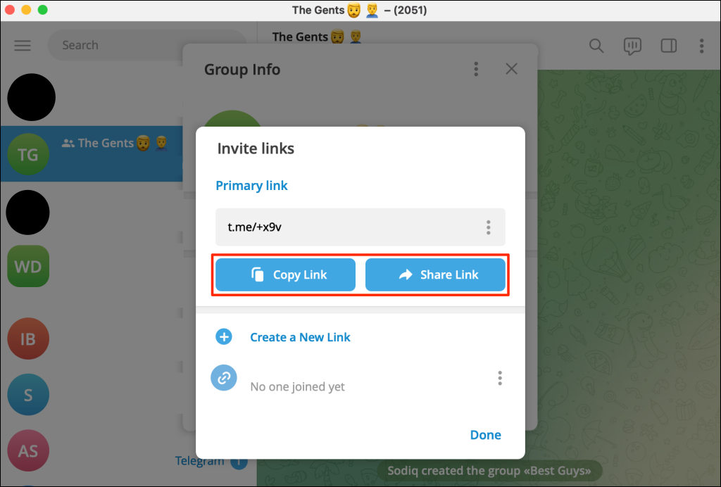 - Select Share link to send the group link to your contacts on Telegram.