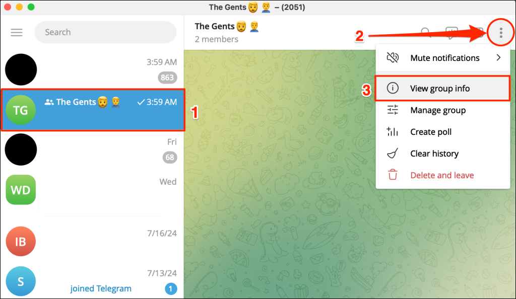 Open Telegram on your computer and follow the steps below to get a group invitation link.