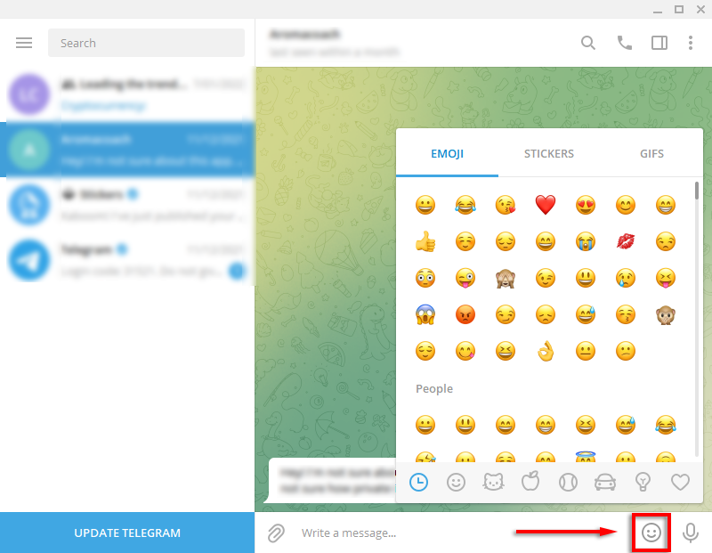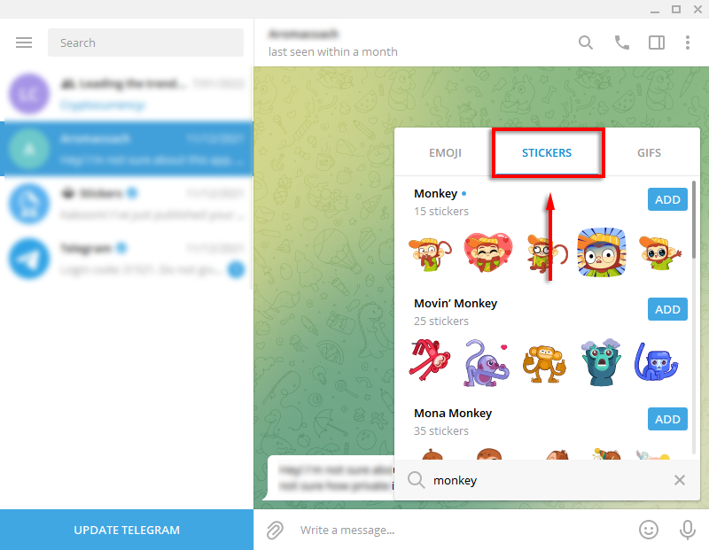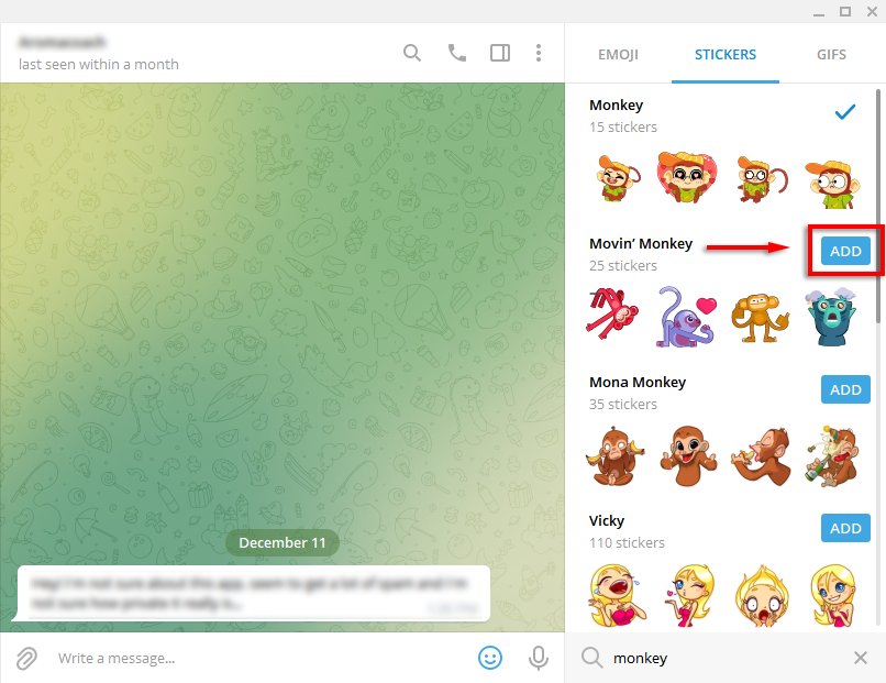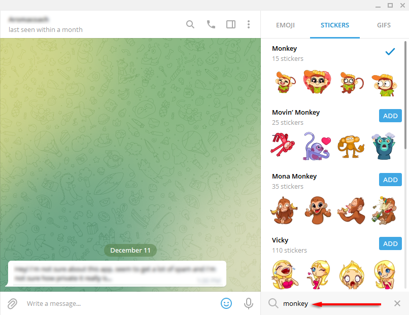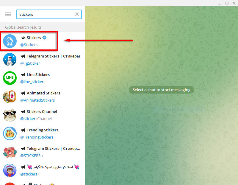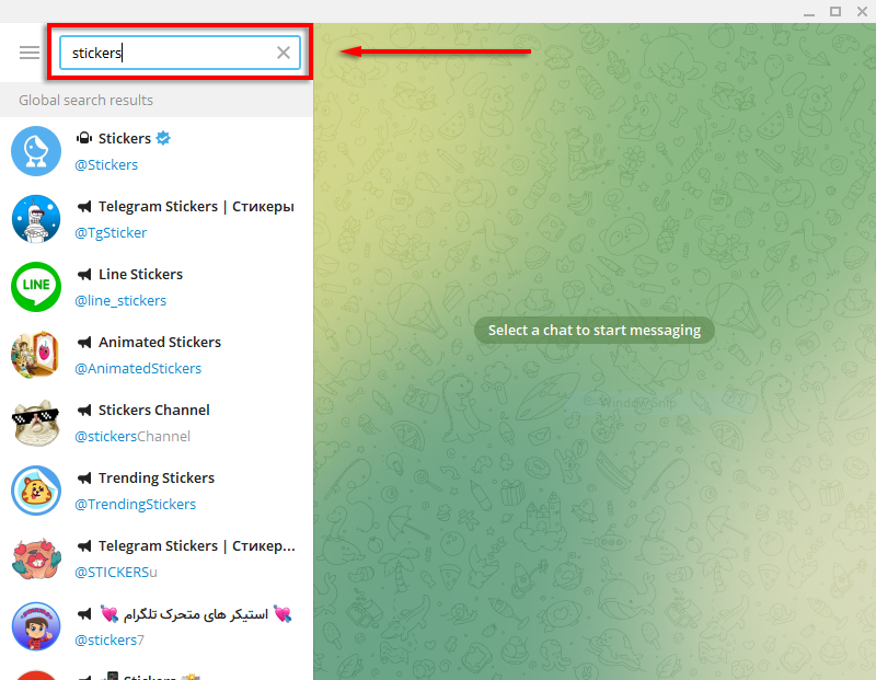 - Click the search icon at the bottom-left of the window, then search for a sticker pack.