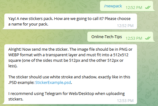 - Type in a short name for your sticker pack and press Enter again. The bot will ask you to upload your sticker.