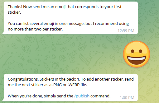 - Repeat these steps for each sticker. Once you’re done, type /publish to finalize your sticker pack. You will now be able to upload a 100 x 100-pixel PNG image as an icon for the sticker pack. You can upload this image in the same way as above or simply skip this step by typing /skip.