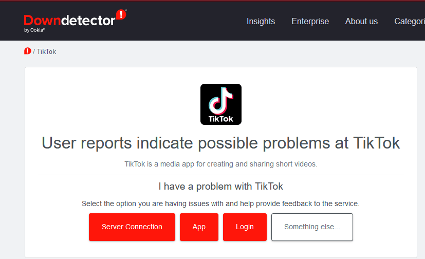 TikTok servers can experience an issue or go through regular maintenance that’ll cause them to go down. If your TikTok app or website is not working properly, it might mean the server has a problem. You can check the server status by going to the Downdetector webpage.