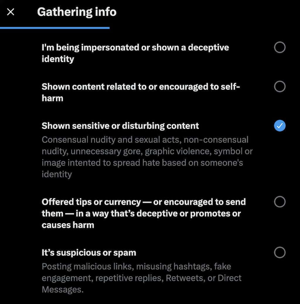 - Answer a few questions under Gathering info and select Shown sensitive or disturbing content in the end. Twitter will then provide recommendations for additional actions you can take to improve your Twitter experience.