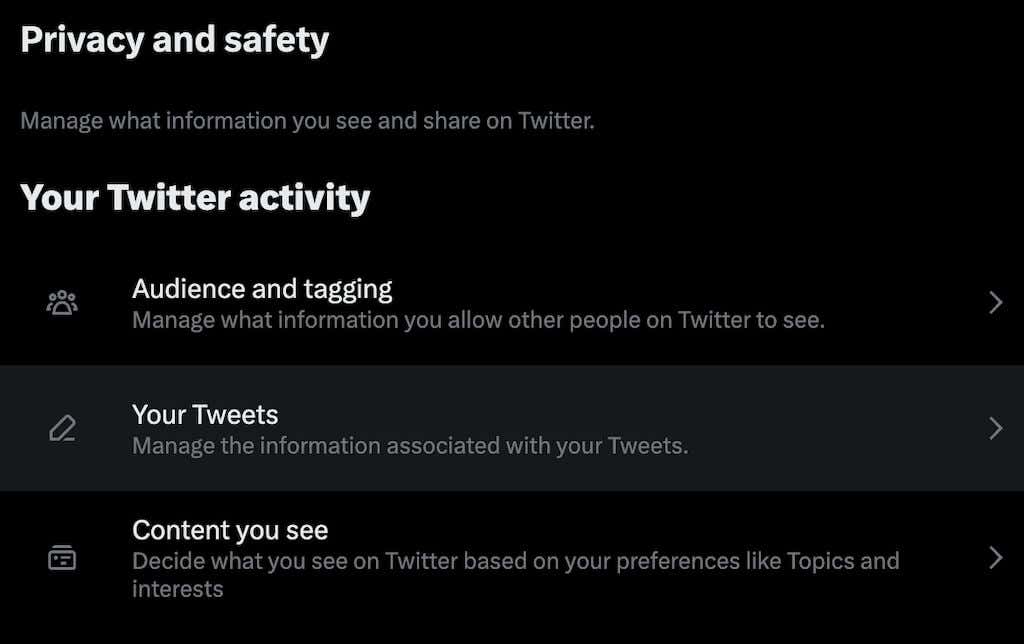 - Follow the path Settings and Support > Settings and privacy > Privacy and safety > Your Tweets.