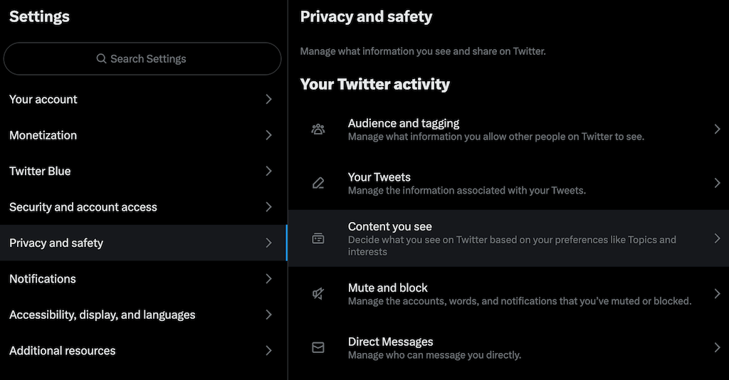 - Select Privacy and safety, then under Your Twitter activity, select Content you see.
