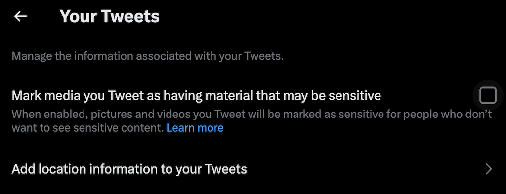 - Uncheck the box next to the Mark media you Tweet as having material that may be sensitive option.