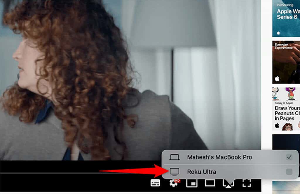 - Select the AirPlay icon at the bottom of the video and choose your Roku device from the list.
