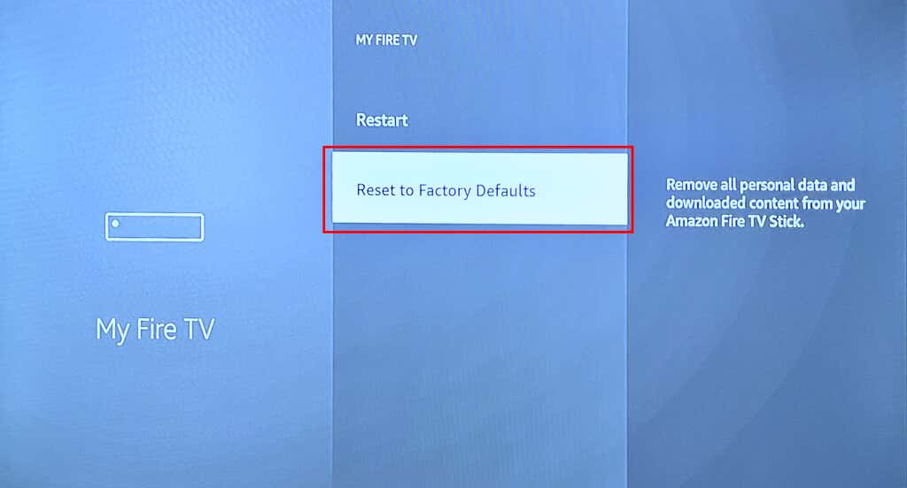 Go to Settings > My Fire TV > Reset to Factory Defaults and select Reset on the confirmation screen.