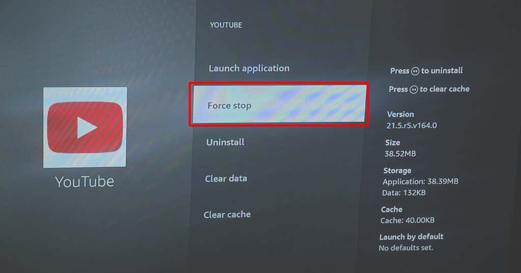 - Choose Force stop to terminate the application and all related processes on your Fire TV device.