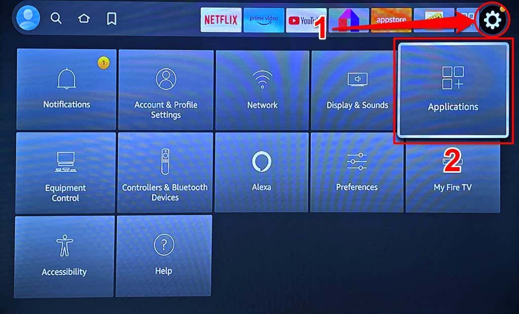 - Select the Settings/Gear icon in the top-right corner of your Fire TV home screen and choose Applications.