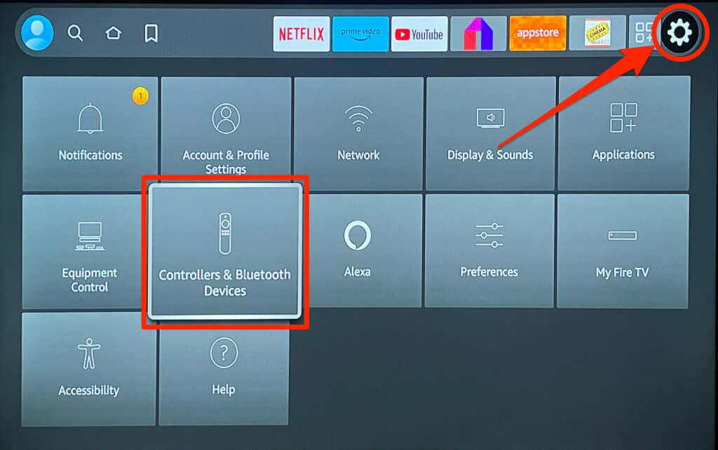 - Navigate to the Gear icon on your Fire TV home screen and select Controllers & Bluetooth devices.