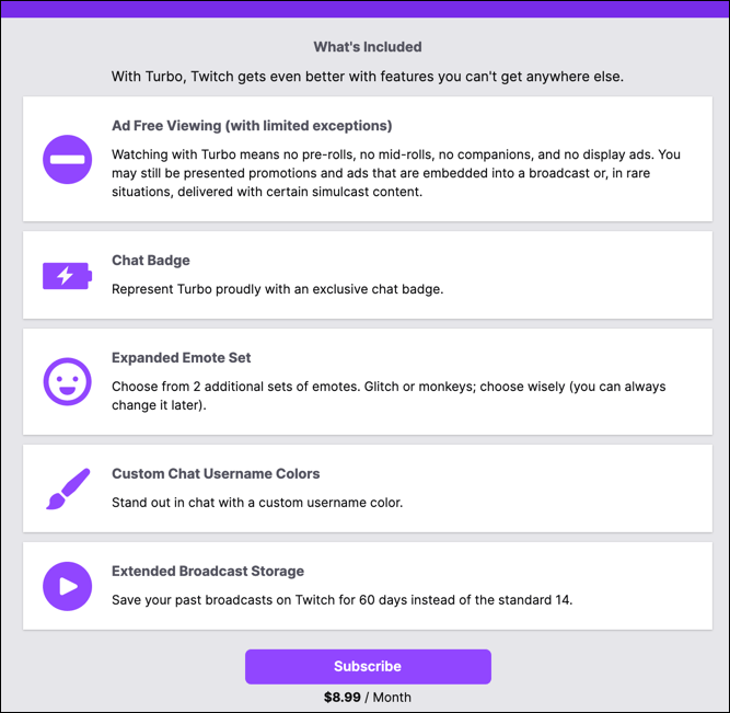 The biggest benefit to Twitch Turbo is going ad-free across the platform. Rather than subscribe to a single channel, you can ditch the ads on any stream or video you watch for an $8.99 a month subscription.