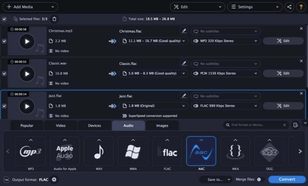 Nonetheless, you’re bound to appreciate the app’s user-friendly approach. The upload process is straightforward: select your files and choose from a range of input and output formats, including MP3, WAV, AAC, and more.