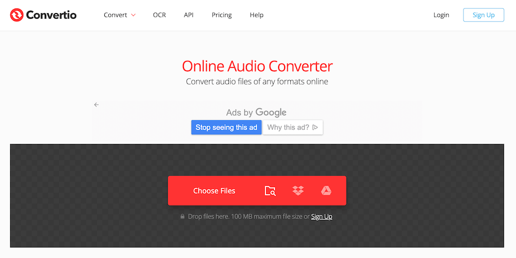 Convertio stands out as a user-friendly online audio converter with a sleek and modern interface that ensures a quick and hassle-free experience. The platform offers convenience by enabling file uploads not only from your computer but also directly from cloud storage services like Dropbox and Google Drive.