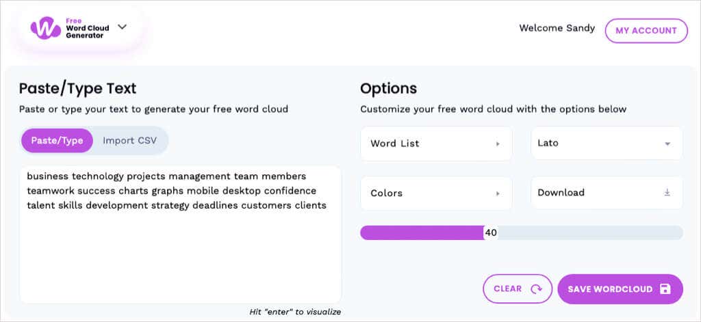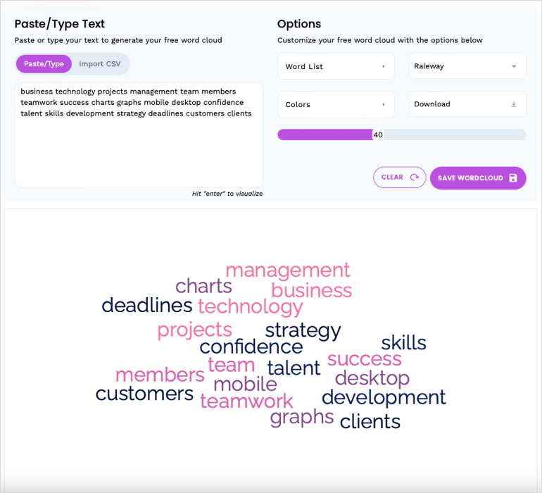 To get started, paste, type, or import a CSV file with your text. You’ll see a default word cloud that you can then customize with the below options.