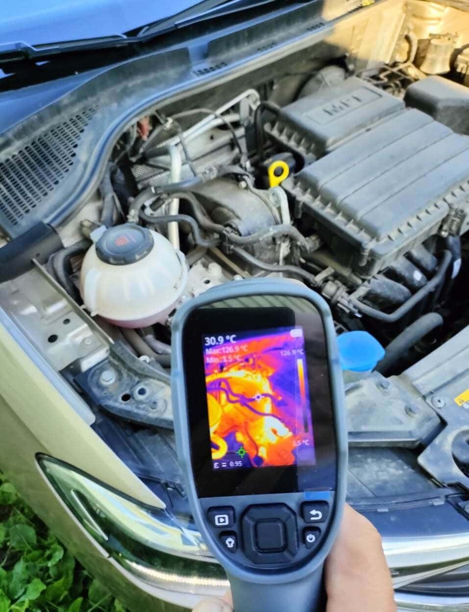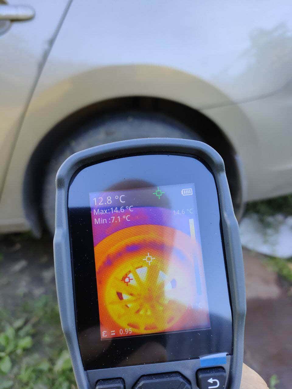When delving into the camera’s performance, it offers an incredible insight into temperature variations. For instance, I was measuring the temperature of the different parts of my car wheels before and after driving, and you can see the red crosshairs showing the hottest spot, while the green identifies the coldest. The hottest element is also shown in white color.
