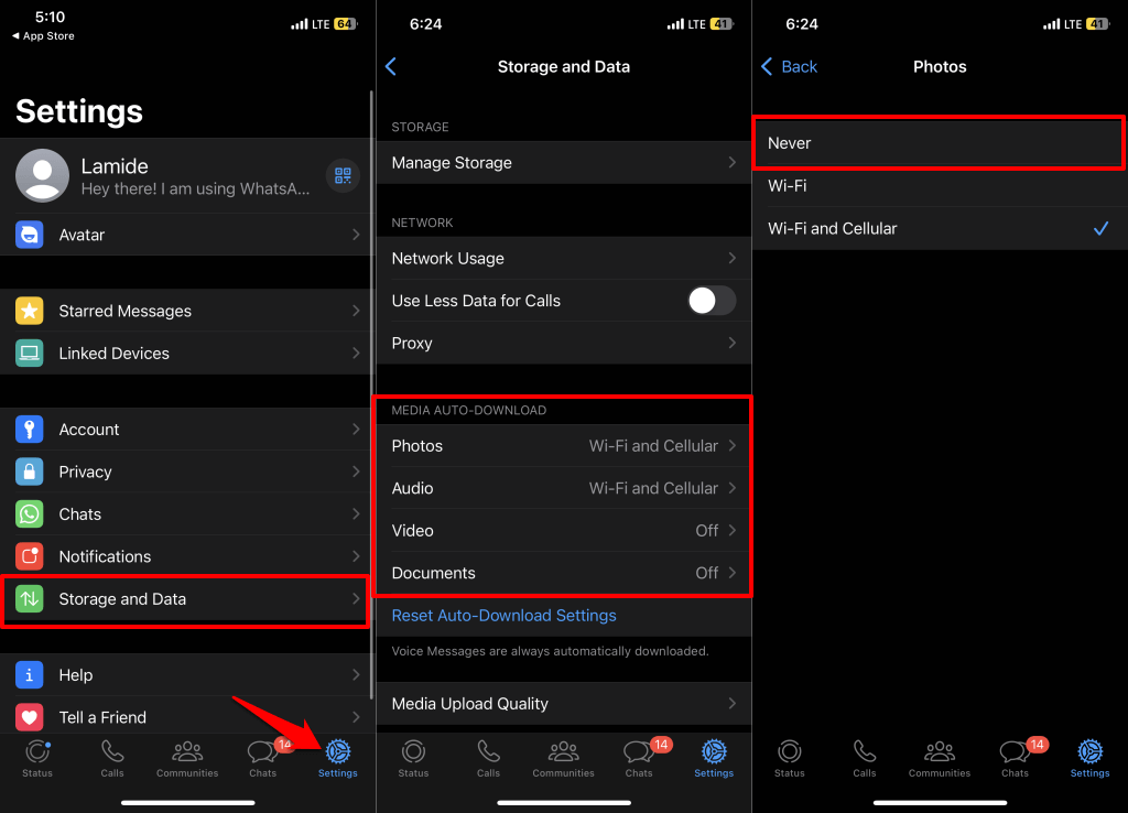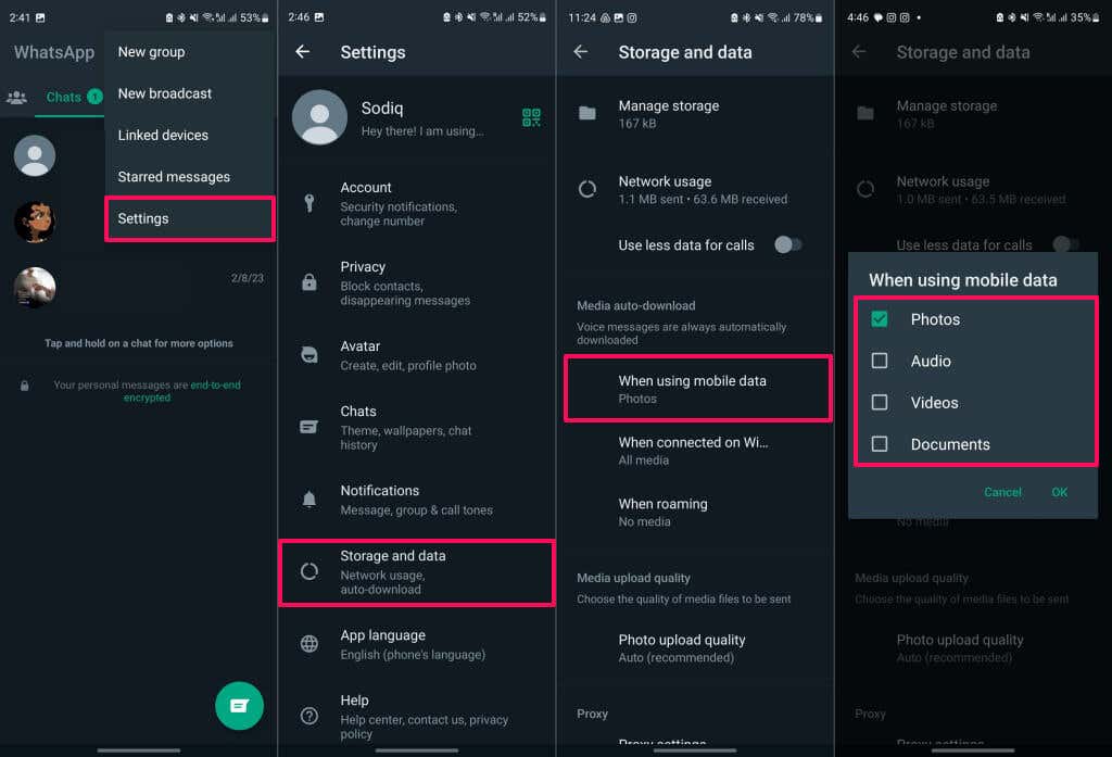 You’ll find the following options in the “Media auto-download” section: When using mobile data, When connected to Wi-Fi, and When roaming.