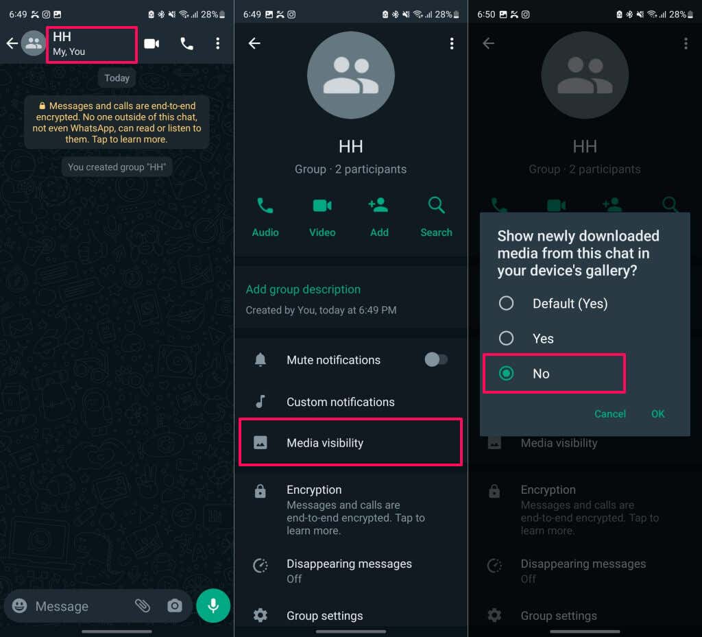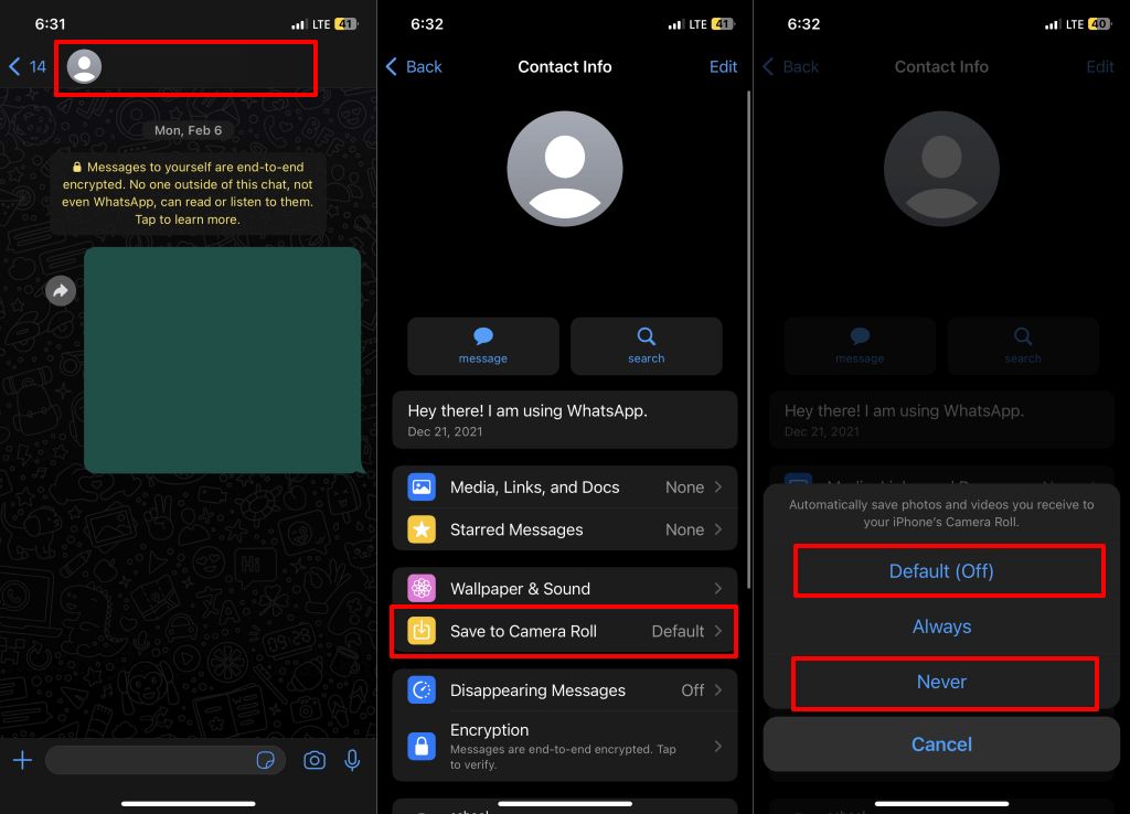 - Select Default (Off) or Never to disable media auto-download for the conversation. New videos or photos from the chat will no longer be saved to your phone’s gallery.