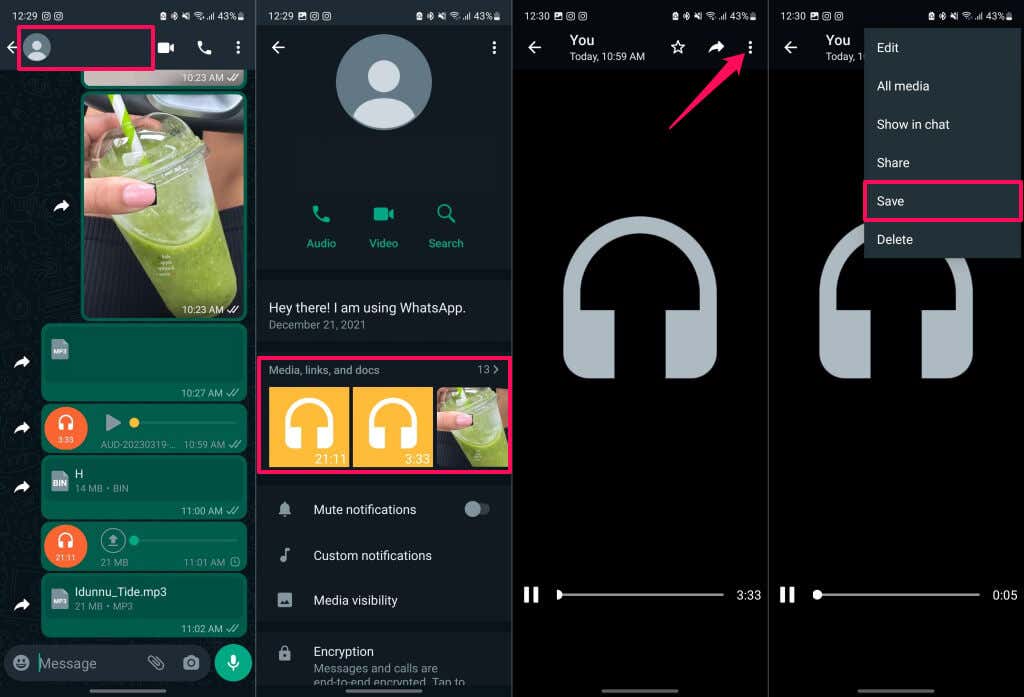 - Tap the person or group profile photo, select Media, Links, and Docs, and open the Media or Docs tab.