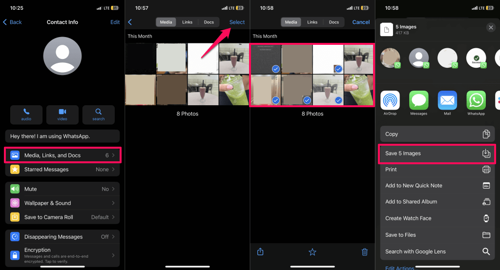 - Tap the Share icon in the bottom-left corner, select Save N Images, and check the Photos app for the files.