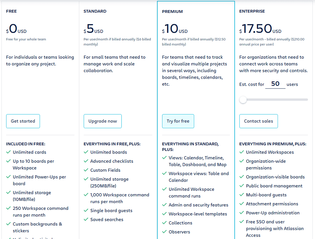 - Standard: $5 per user per month (billed annually). Unlimited boards and more advanced features for small teams.