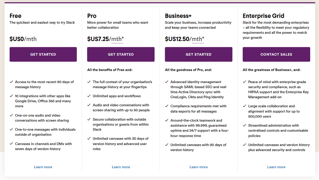 - Enterprise Grid: Slack’s enterprise-grade plan — contact Slack’s sales department to learn more.