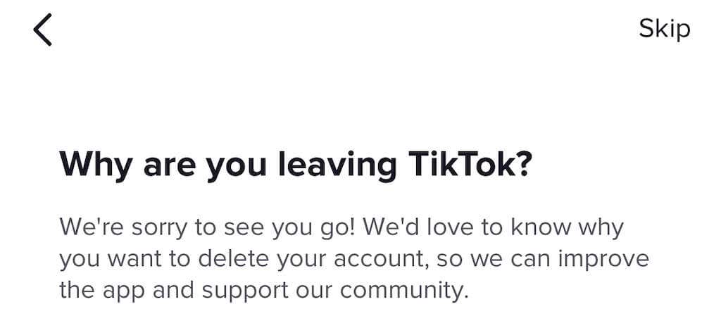 - You can select a reason why you’re leaving the platform, or you can tap Skip in the top-right corner.