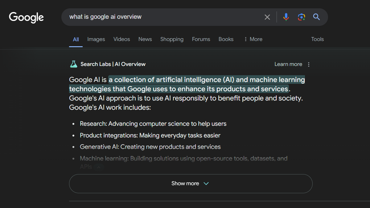 Google Search AI Overviews are AI-generated summaries that appear at the top of search results. They’re designed to provide quick answers and relevant information snippets, streamlining the search process by offering concise answers and eliminating the need to scroll through search results.