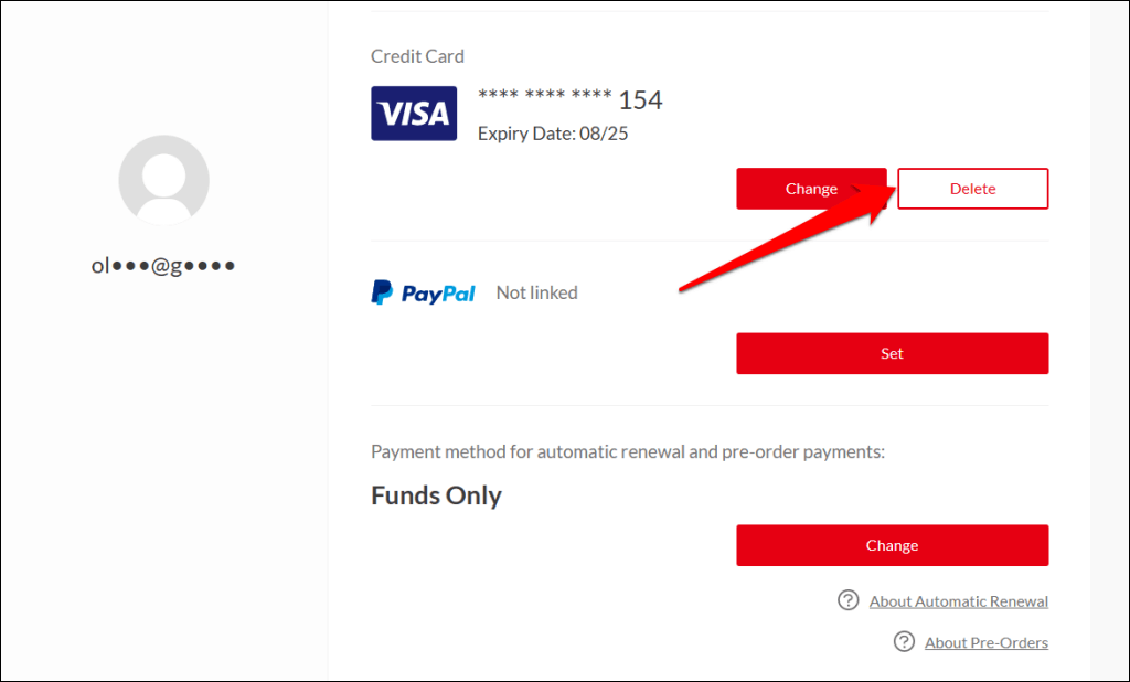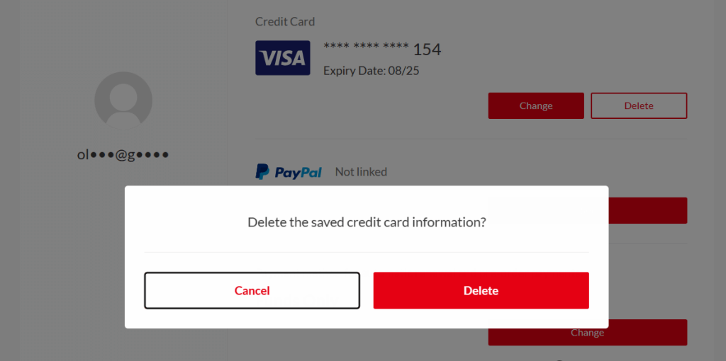 - Select the Delete button next to the card(s) in the “Credit Card” section.