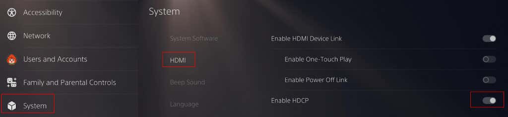 If none of the above fixes have worked for you so far, another thing you can try is disabling game mode and HDCP (high-bandwidth digital copyright protection) by going into your PS5 settings. HDCP prevents external devices recording video from your console, so don’t disable this if you’re using a game capture device to record video. If you want to disable HDCP, here’s how to do that: