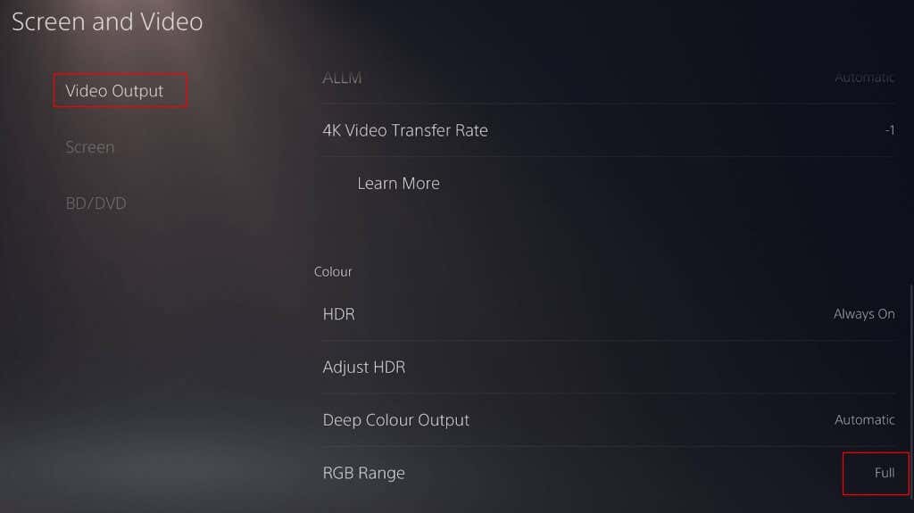 - Select Video Output, scroll down, and select 4K Video Transfer Rate.