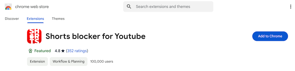 - Search for a YouTube customization extension using keywords like “Block YouTube Shorts” in the Chrome Web Store or Firefox Add-ons. If you’re using Google Chrome, one extension we can recommend is Shorts Blocker for YouTube.