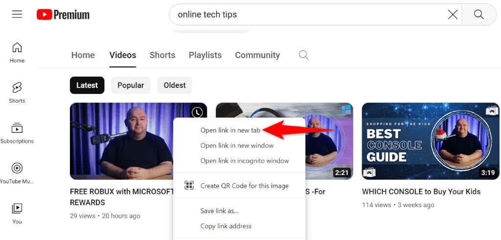 If you’ve tried that method but to no avail, the alternate method is to right-click the video and select Open link in new tab. This launches the selected video in a new tab.