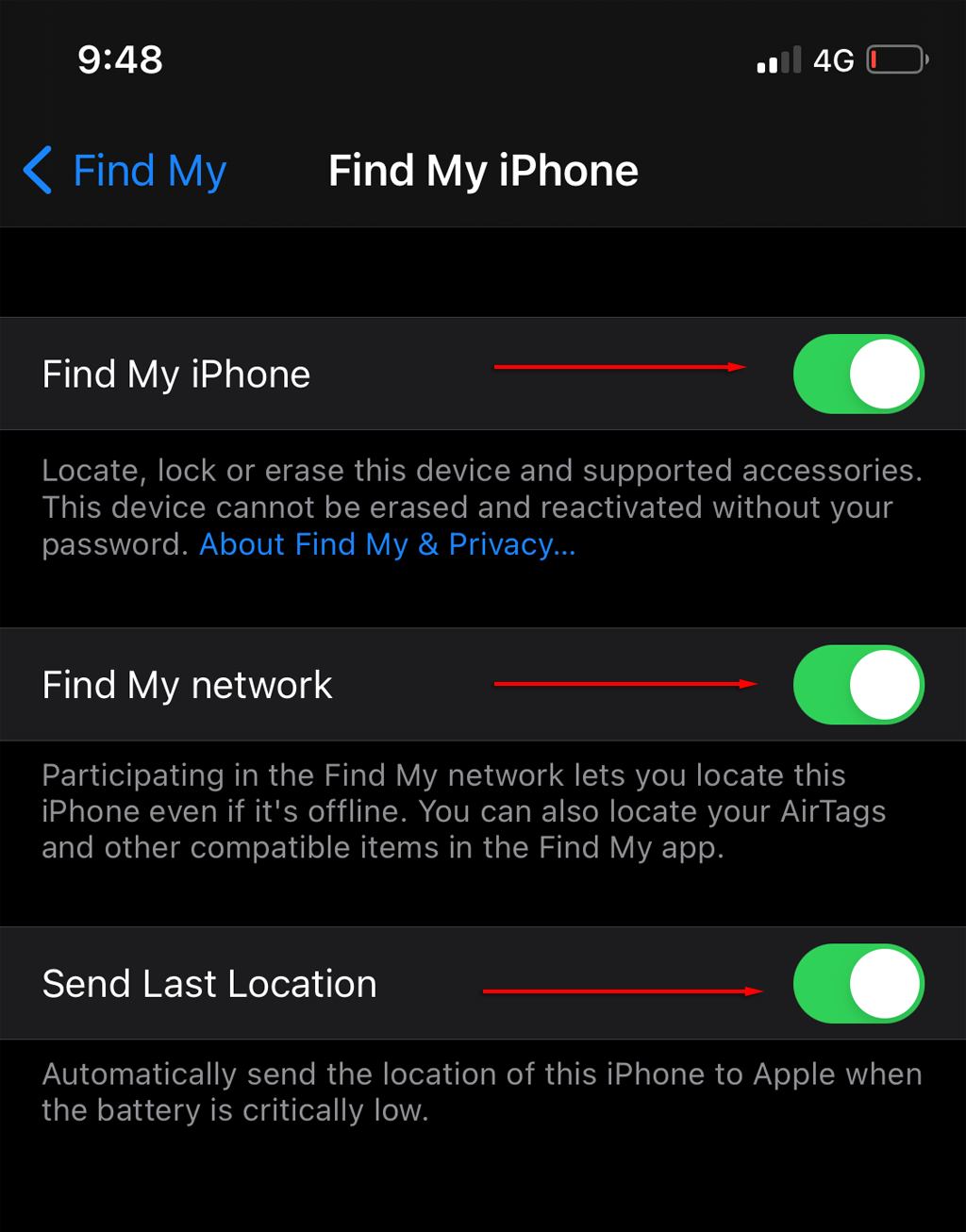 Note: Send Last Location will save the last location of your iPhone before it loses power. The Find My network will allow other nearby iOS users to locate your iPhone even if it’s turned off.