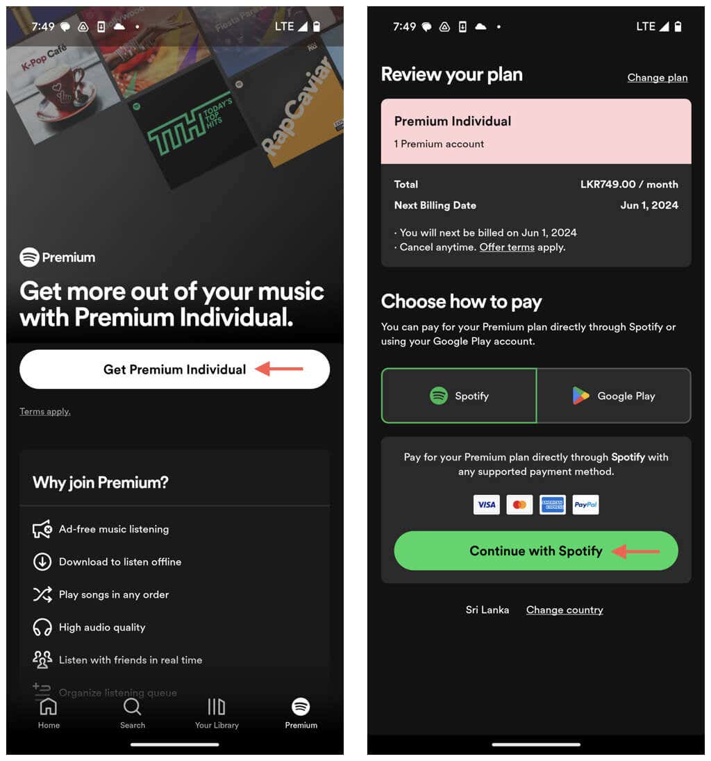 On Android, tap Get Premium under the plan you want to subscribe to and purchase through Spotify or Google Play. If you’re using an iPhone, sign into your Spotify account via Safari, go to Account Overview, and select Join Premium.