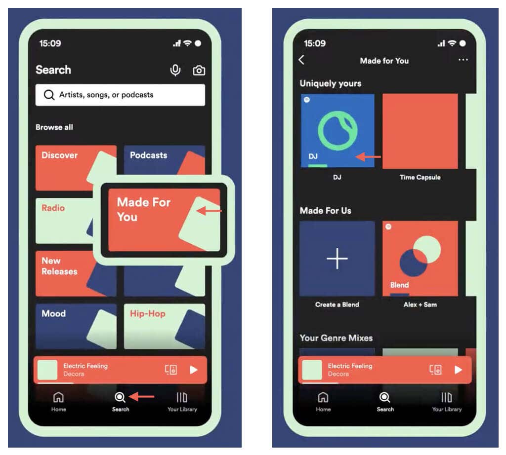 Upgrading to Spotify Premium will unlock Spotify DJ and other perks like ad-free listening, high-quality audio, and offline playback. Tap the Premium icon at the bottom left corner of the Spotify app to view available plans.