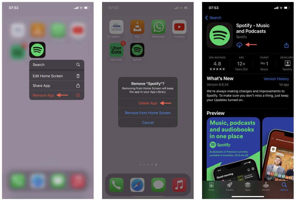 - Long-press the Spotify icon on the Home Screen and tap Remove App (iPhone) or drag it to the Trash (Android).