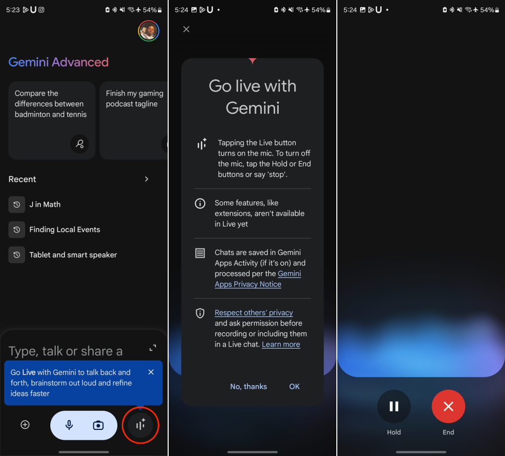 With Gemini Live, users can have a full-blown and free-flowing conversation with Gemini about a topic, idea, event, or anything. Like a person-to-person conversation, users can interrupt Gemini to add more details or change topics without ending the conversation.