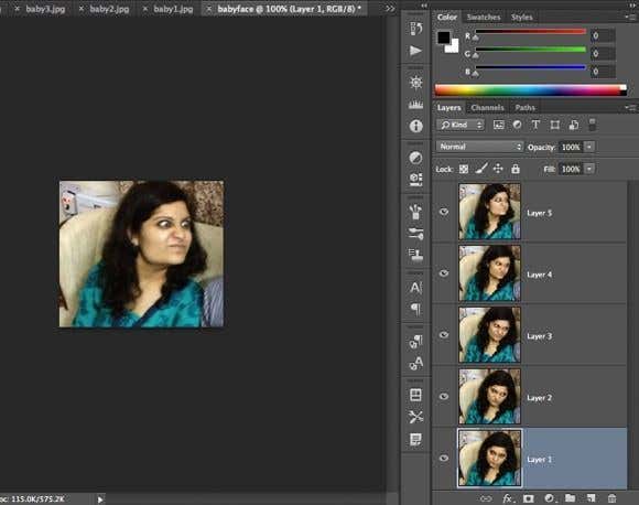 The first thing you’re going to need to do is import all your images into separate layers in one photoshop file. So if you have 6 images, for example, open all of them in Photoshop and then create a new file and copy and paste each of the images into a separate layer in the new file. Layer 1 should be your starting picture and the last layer should be the last picture in the animation.