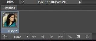 When you do this, you’ll now see only one image in the timeline with a small little 1 in the top left corner. It will either be the image you have selected in the Layers panel or it’ll be the most recently added layer (last image in the animation). At this point, it’s a one frame animation, which is not what we want.