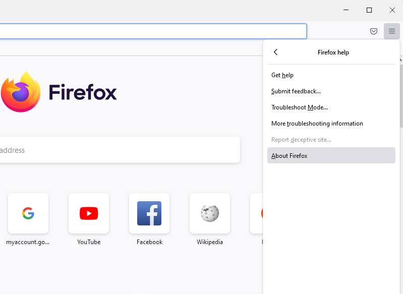- Click the hamburger icon at the top right of the browser and select Help > About Firefox.