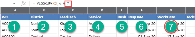 - To select the Index, or column, that we want to pull data from, count from A to H. H is the 7th column so enter 7 in the formula.