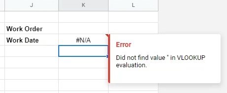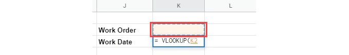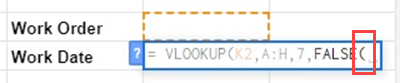 - Select the cell to the right of Work Date and start entering the formula =VLOOKUP. A help box will pop up as we type, showing us available Google Sheet functions that match what we’re typing. When it shows VLOOKUP, press Enter, and it will complete the typing.
