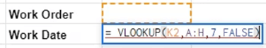 To test the VLOOKUP formula, enter the first work order number in the cell above the formula and press Enter. The date returned matches the date in the WorkDate column for work order A00100.