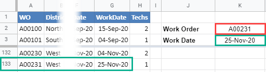 Let’s say you have a service business and you want to find out when a work order starts. You could have a single worksheet, scroll down to the work order number and then look across the row to find out when it starts. That can become tedious and prone to error.
