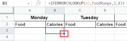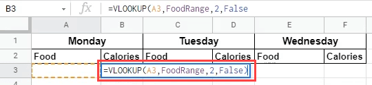 - Go back to the worksheet where food is tracked. In the first cell in which we want calories to show, we could enter the formula =VLOOKUP(A3,FoodRange,2,False).