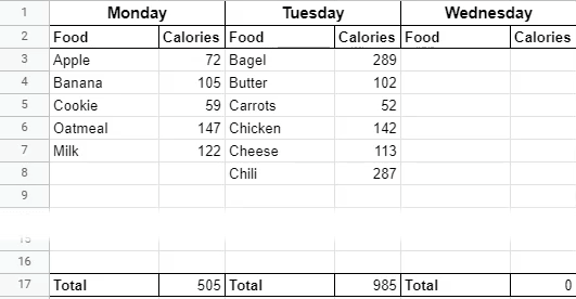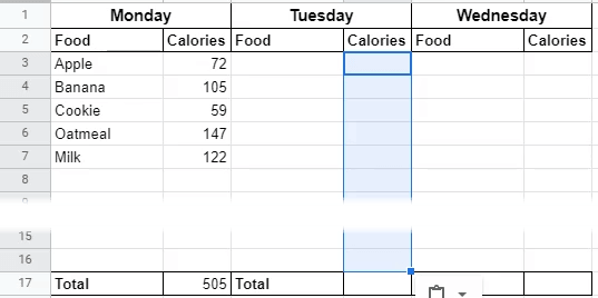 - Select the column of calories from Monday and paste it to the Calories column for Tuesday, Wednesday, and so on.